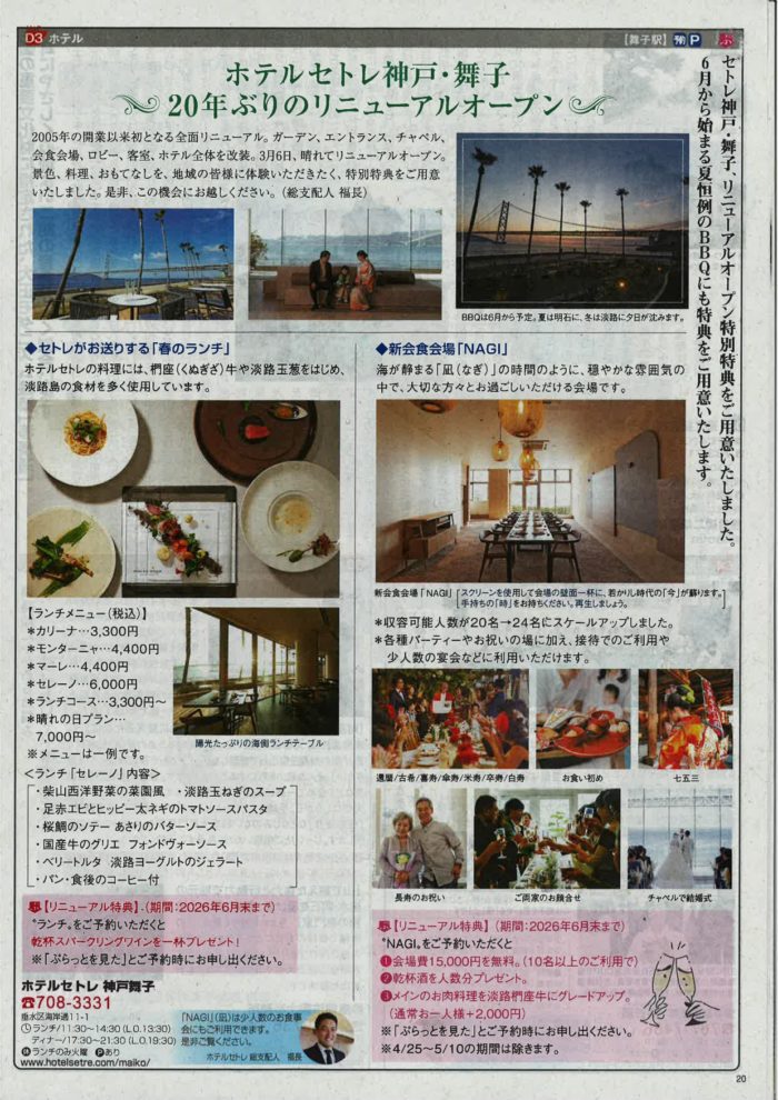 地域情報誌「ぷらっと」5月号に、ホテル セトレ神戸・舞子が、2005年の開業以来初となる全面改装を行い、2026年3月6日(金)にリニューアルオープンしたことをご紹介いただきました。