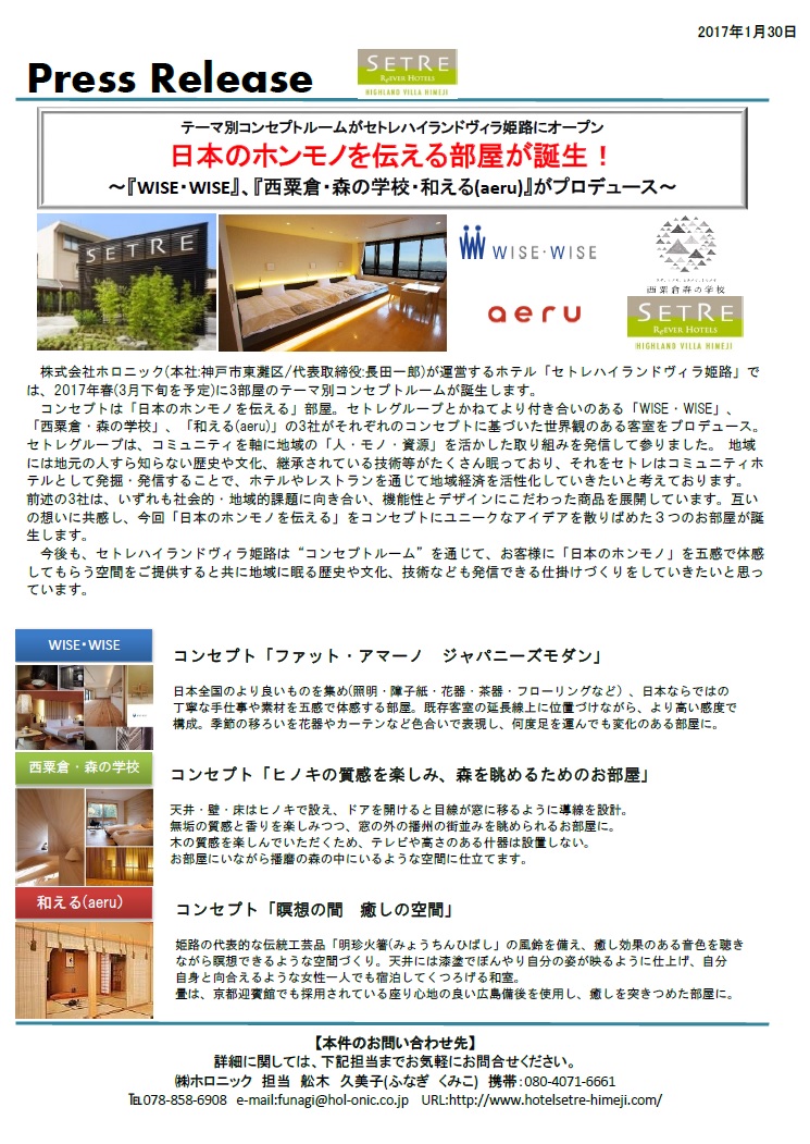 ホテル「セトレハイランドヴィラ姫路」では、2017年春(3月下旬を予定)に3部屋のテーマ別コンセプトルームが誕生します。