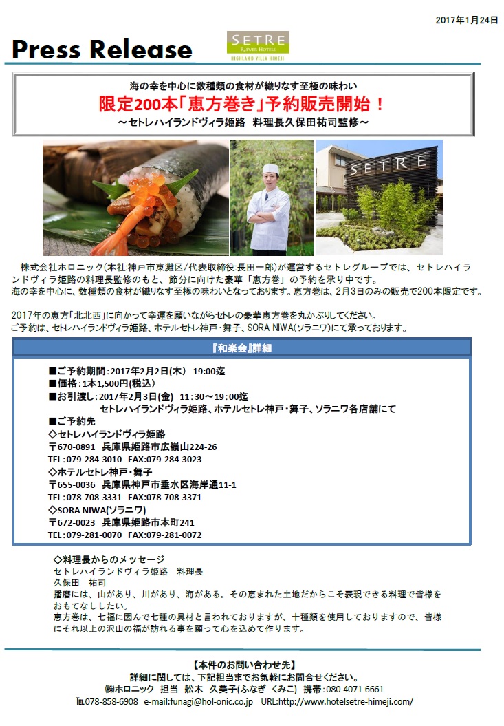セトレグループでは、セトレハイランドヴィラ姫路の料理長監修のもと、節分に向けた豪華「恵方巻」の予約を承り中です。