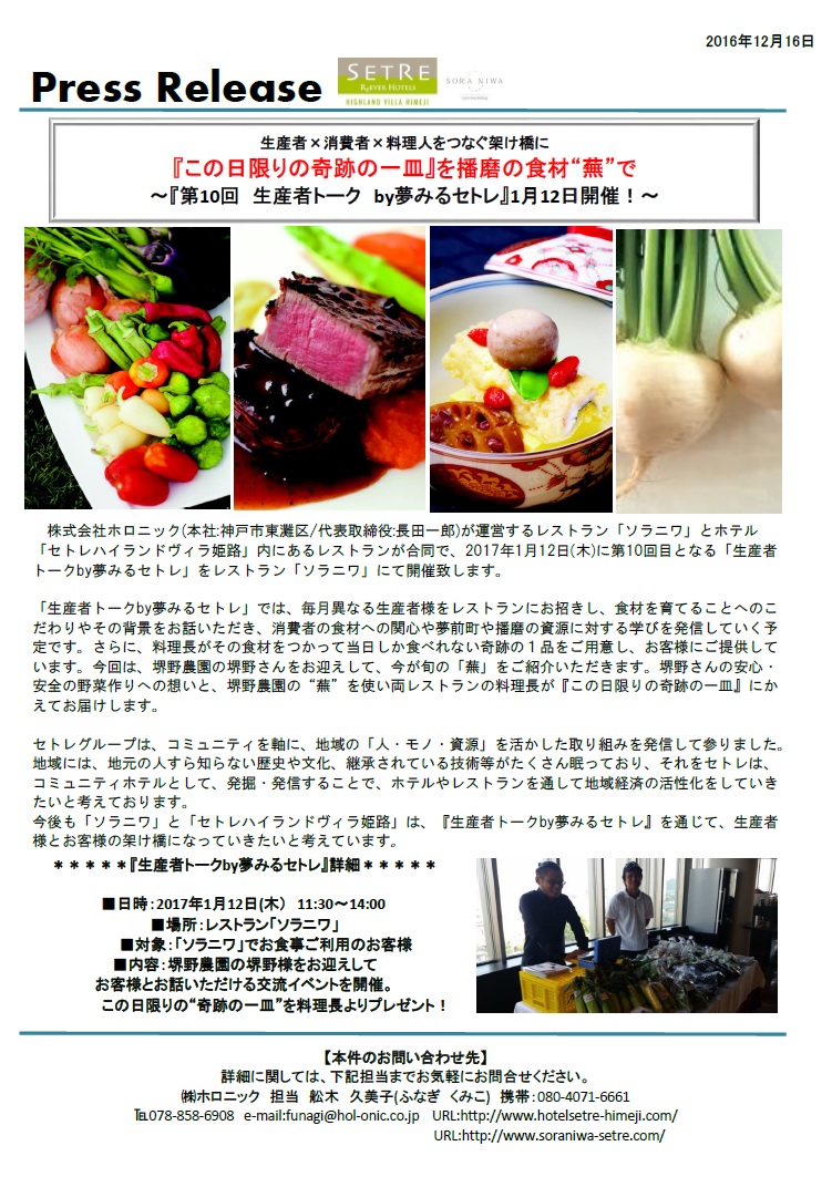レストラン「ソラニワ」とホテル「セトレハイランドヴィラ姫路」内にあるレストランが合同で、2017年1月12日(木)に第10回目となる「生産者