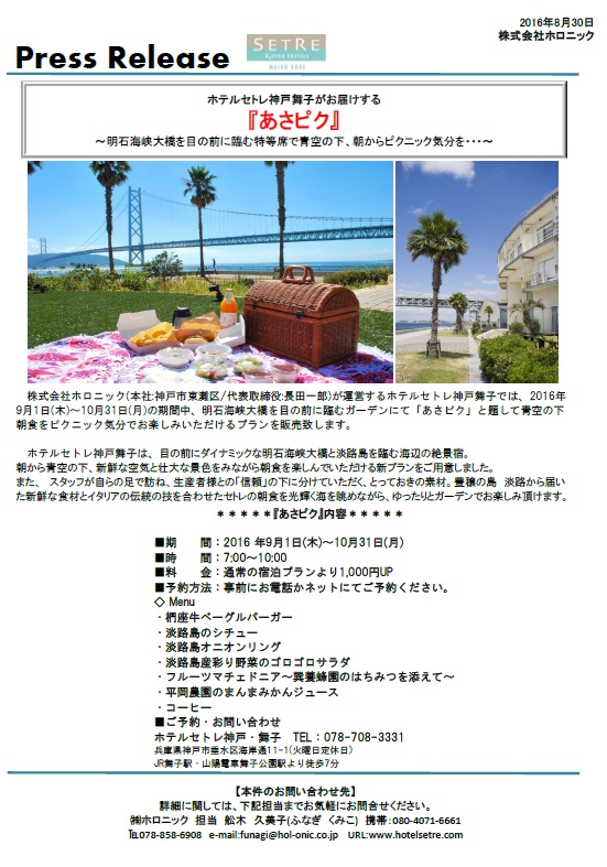 セトレ神戸・舞子とセトレマリーナびわ湖で宿泊プランのオプションとして「あさぴく~朝からピクニック気分~」が9月1日~販売スタートします。