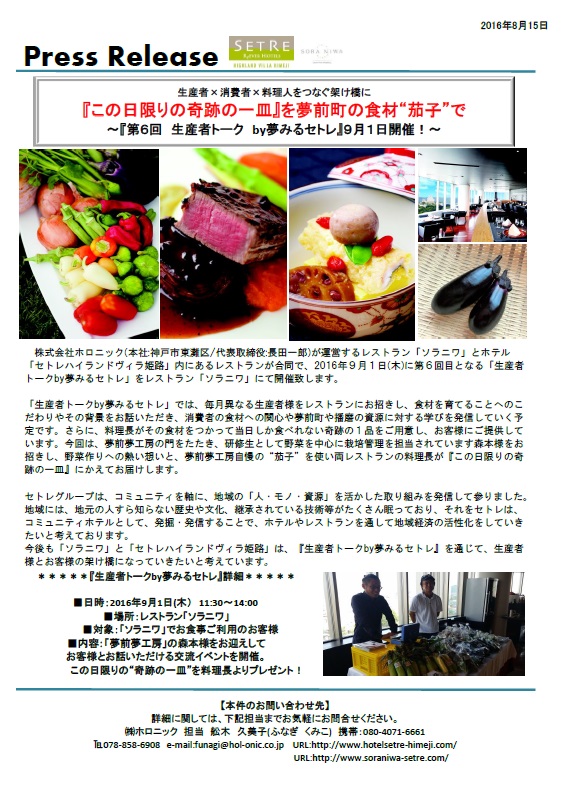 毎月第1木曜日にレストラン『ソラニワ』で開催されている「生産者トーク」が、次回2016年9月1日(木)11:30~14:30に開催されます。