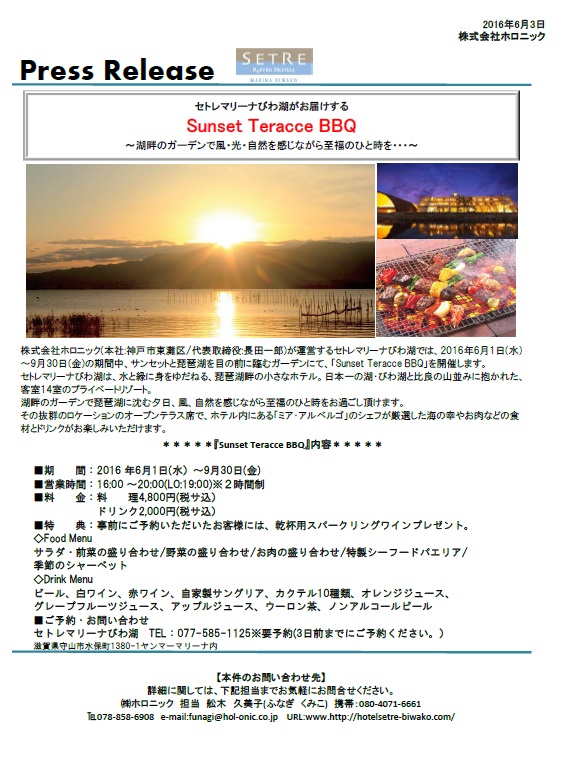 2016年6月1日(水)~9月30日(金)の期間中、サンセットと琵琶湖を目の前に臨むガーデンにて、「Sunset Teracce BBQ」を開催します。