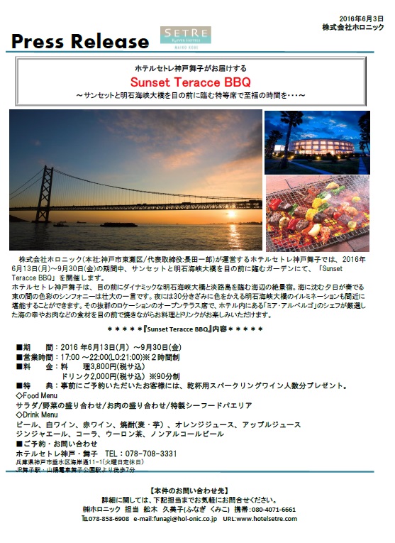 2016年6月13日(月)~9月30日(金)の期間中、サンセットと明石海峡大橋を目の前に臨むガーデンにて、「Sunset Teracce BBQ」を開催します。