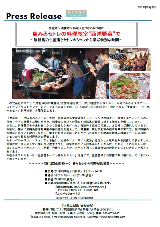 2016年6月23日(木)に第12回目となる生産者トーク「島みるセトレ料理教室」を開催致します。