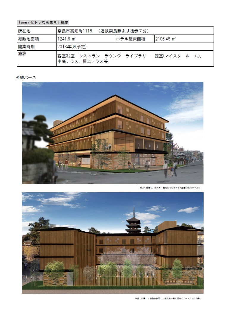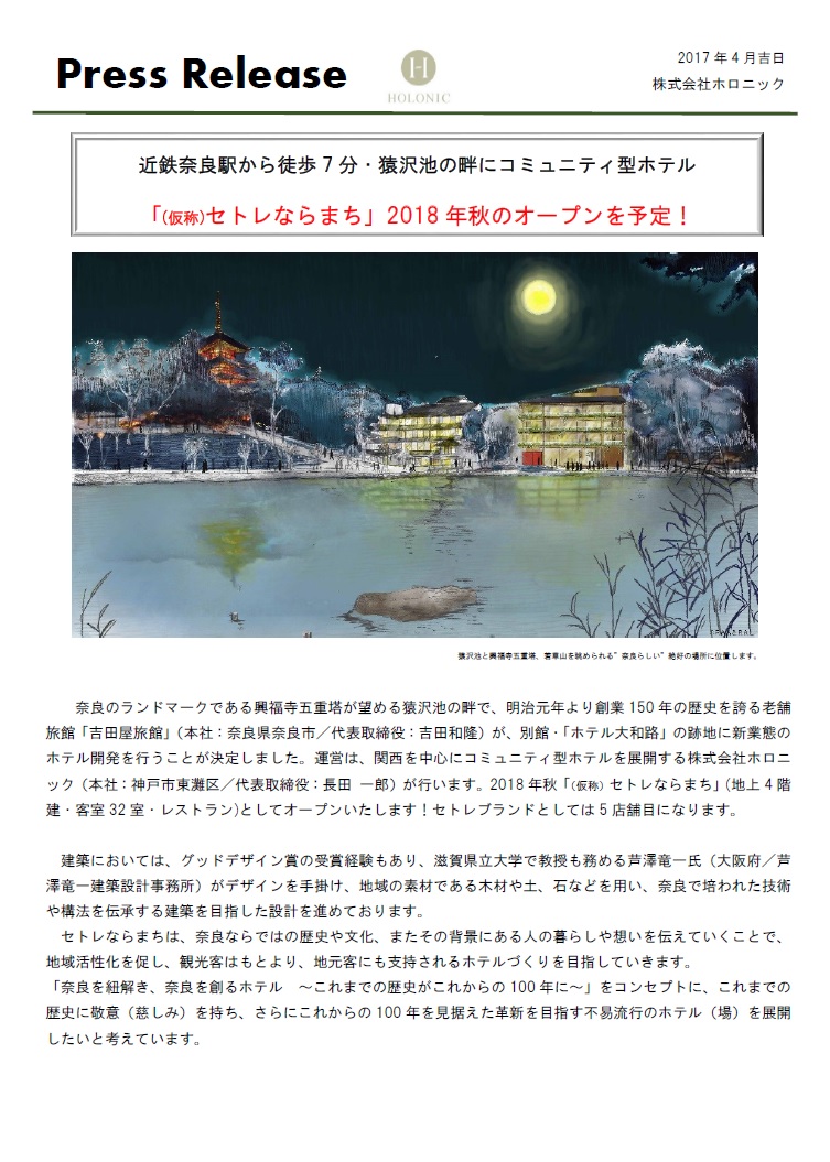 奈良 のラ ンドマークである興福寺五重塔が望め猿沢池の畔、明治元年より 創業 150 年の 歴史を誇る老舗旅館 「吉田屋旅館 」(本社:奈良県市/代表取締役吉田和隆)が、別館・ 「ホテル大和路」の 跡地に新業態のホテル開発を行うことが決定しまた。 運営は、 関西を中心にコミュニティ型ホテルを 展開 する 株式会社ホロニック(本社:神戸市東灘区 /代表取締役::長田 一郎)が行います。 2018 年秋 「(仮称) セトレならまち」 (地上 4階 建・客室 32 室・レストラン 室) として オープン いたします !セトレブランドとしては 5店舗目に 店舗目に 店舗目に なり ます。