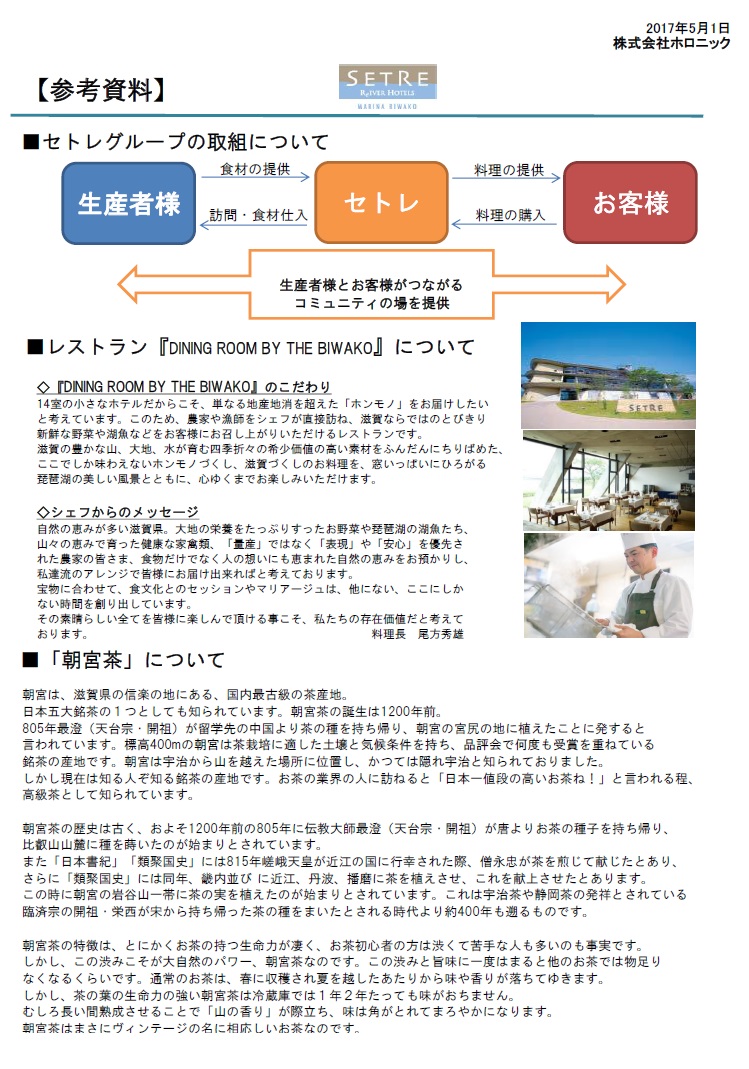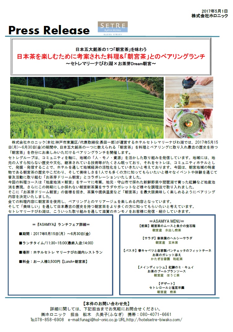 ホテルセトレマリーナびわ湖では、2017年5月25日(木)と6月15日(木)の2日間限定で、日本五大銘茶の一つに数えられる「朝宮茶」