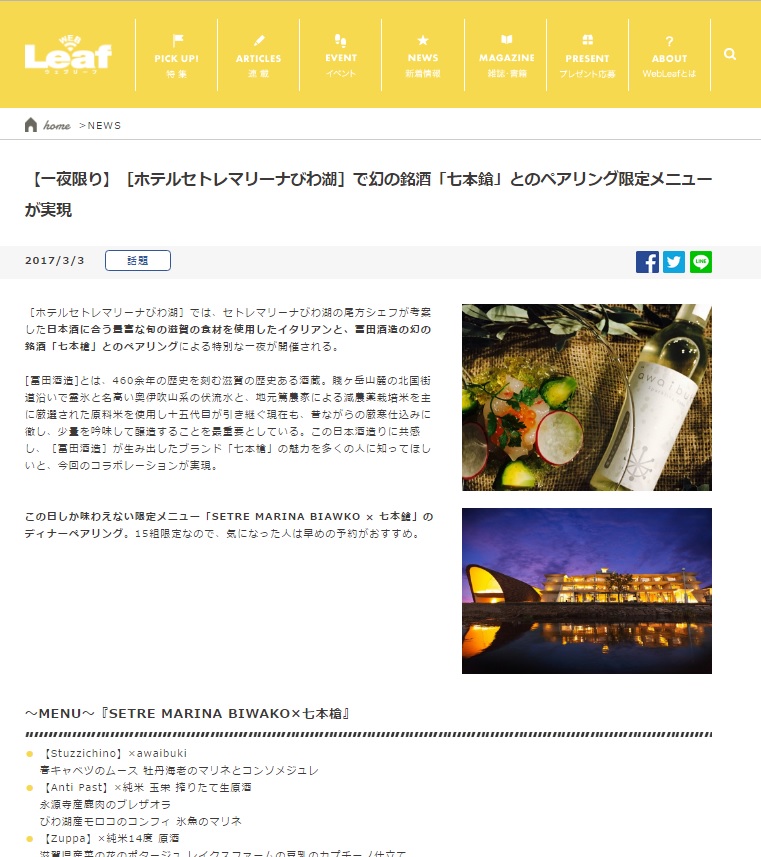 「Leaf」にセトレマリーナびわ湖の「SETRE×七本槍」の情報が掲載されました!