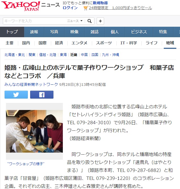 9月28日(水)Yahoo!ニュースと姫路経済新聞で、セトレハイランドヴィラ姫路で9月26日(月)に開催された“第2回SETRE×速鳥丸”のイベント和菓子作りワークショップの内容が掲載されました。