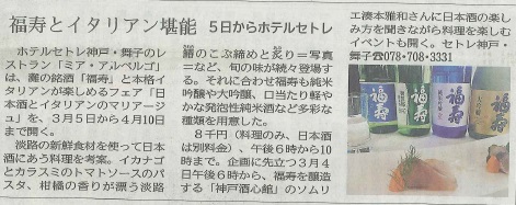 セトレ神戸・舞子で行われる“日本酒とイタリアンのマリアージュ”が神戸新聞青空主義で紹介されました!